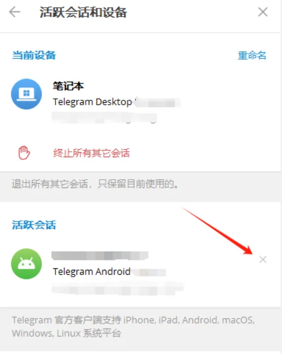 - 点击未知设备,选择“终止会话”移除,确保仅保留可信设备。
